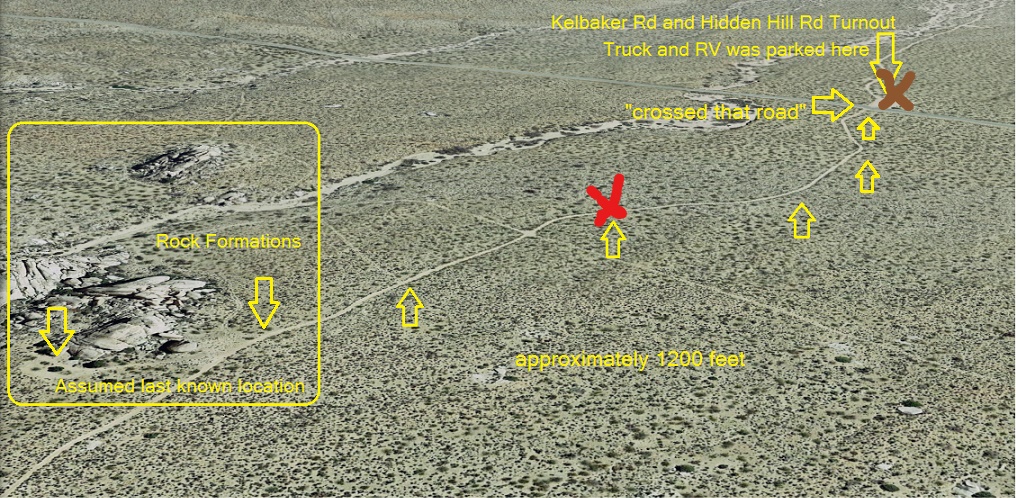 That said, they look climbable, so maybe it doesn't matter what we call them. Still, I'm wondering whether RT would've referred to rock formation as a hill. Also, @dbdb11's sister recalled that RT in a call to family said BT took the 360 photo that morning, which doesn't fit with an early afternoon walk from Kelbaker/Hidden Hill. Again, the time-line is muddled. So maybe the 360 photo was taken from somewhere else??