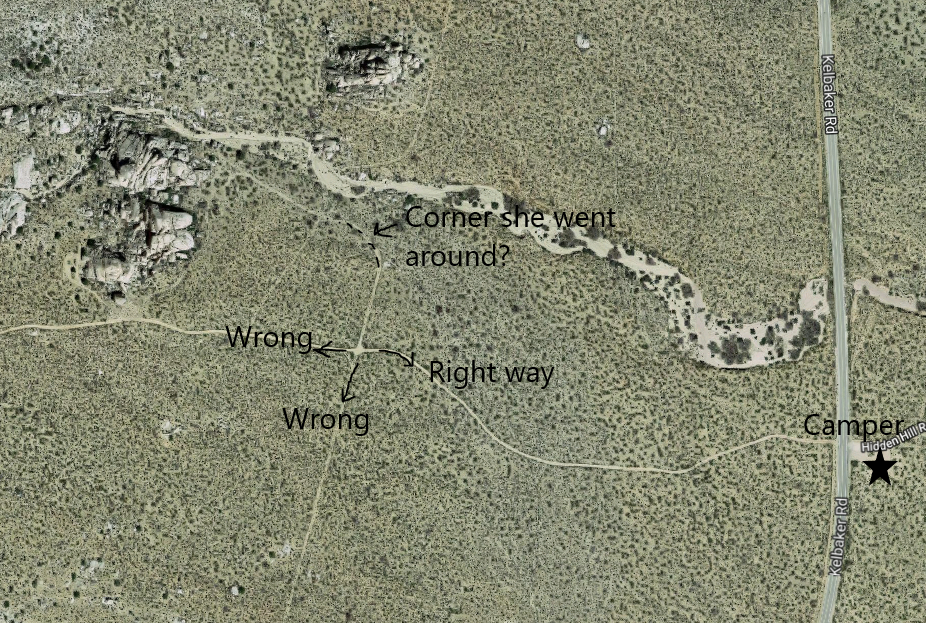Easy to get lost AND stay on a trail- Remember that she had been drinking, perhaps more than one, it was blazing hot, she was in a hurry perhaps why she went ahead, no way you could see the RV from that turn.... She only needed to make one tiny mistake at the junction of those trails and bingo, she's lost.