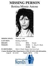 | On April 1,1980, Tina called a family member to say she was going camping in the Clear Creek area of Redding, CA with two male friends. An entry in her calendar said she was going hiking in the Lassen Park area. Tina left personal belongings and her vehicle behind and has not been seen nor heard from since. Tina wears prescription glasses and has pierced ears. Tina is considered at risk due to health issues. |