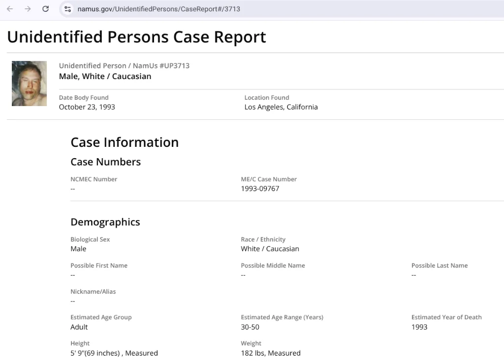 I went over to the NamUs listing for Blake Nex and looked at the exemptions. To my surprise, the only exemption listed is from an unidentified case from my hometown of Merced. I actually wrote two different Medium posts about this - this person is identified but the next of kin hasn't been alerted.