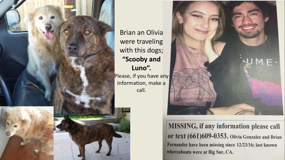 "The Monterey County Sheriff's Office Aerosquadron took flight to search for Olivia and Brian's car along our county's coast line. Ground units with the California Highway Patrol, California Fish and Wildlife and California State Park Rangers assisted with search efforts."