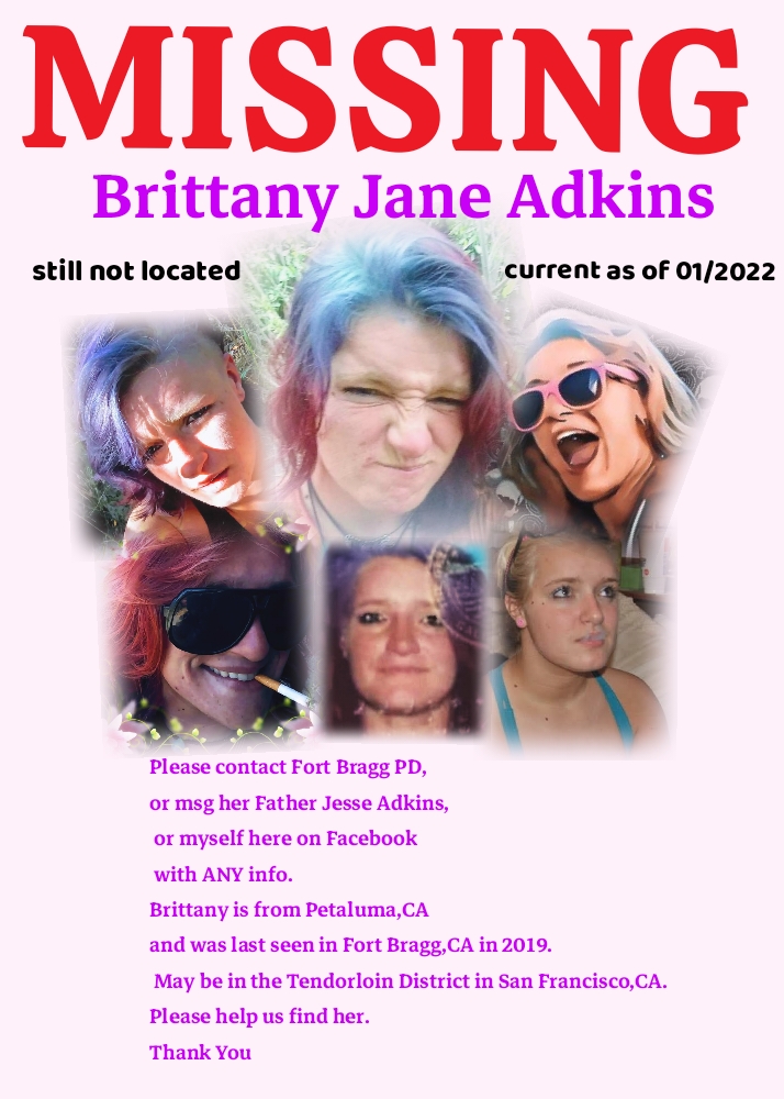 Brittany Jane Adkins is from Petaluma, CA and went to FORT BRAGG ,CA with her now Ex boyfriend Dan Lynch and of course her dog Janie. She has actually been MISSING since 12/2019. Her Dad, Jesse Adkins shouldered the search for her by himself distributing flyers ( which we have time stamped and dated from then ) by himself - with no help from Police. As a friend of her Dad's, as well as someone who cares very much for Brittany I was shocked to learn she had been MISSING at all? And I found this out thru a friend this past March 2021?! Why had this not had any attention brought to it? So, I contacted Jesse and offered to help. And I proceeded to hit Social media by storm. Brittany had her Food Stamp case closed as she had not been by to pick up her mail where it was being sent. Also, she has a Grandfather who was helping her with money - also has not seen or heard from her. No this is NOT something normal for Brittany to do to her friends and family - disappear without a word. If she didn't want to talk to someone she wouldn't, but she would never do this to all the people that love and care about her. She had lost her Mom a few months prior to her disappearance as well. While searching online for anything new or recent on Brittany I came across a story in a Mendocino County News section about another MISSING woman who disappeared 4 months after Brittany had technically gone MISSING, the MISSING woman from FORT BRAGG, CA was Barbara Crane-Shealor. And the article was about her friend Brandy kicking up some dust all over the place because NOTHING WAS BEING DONE TO FIND BARBARA CRANE-SHEALOR?! And I noted in the article it mentioned 2 other MISSING PERSONS CASES in Fort Bragg and BRITTANY ADKINS was not 1 of them?! Why?!
