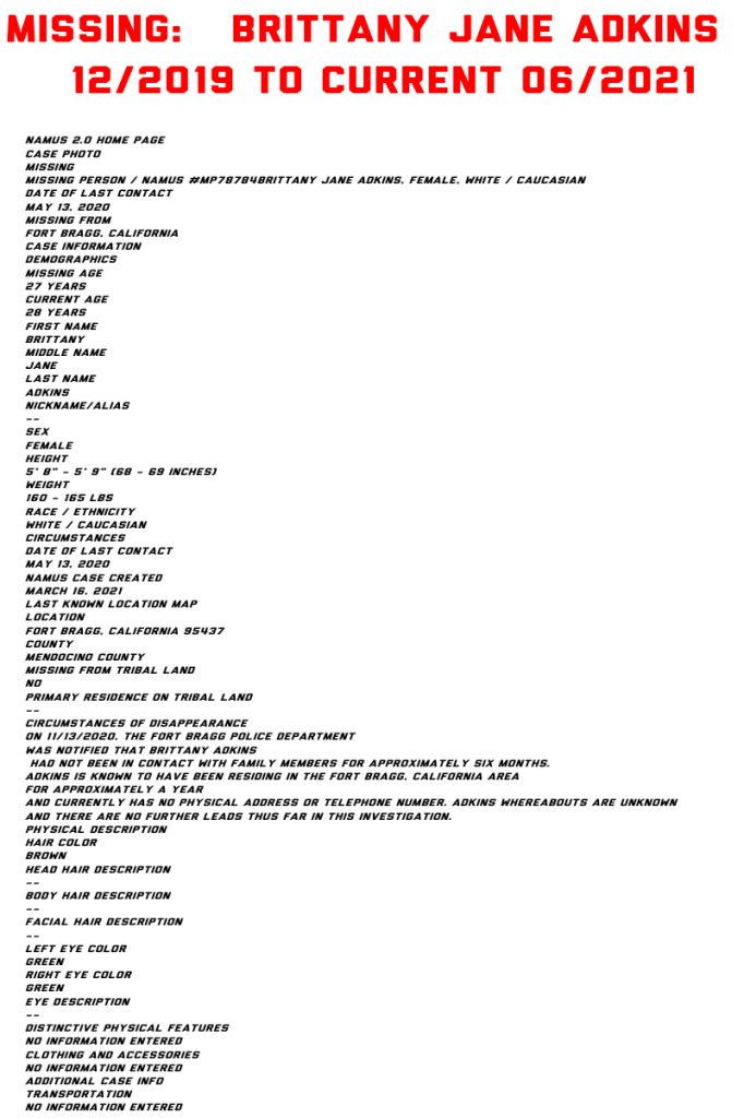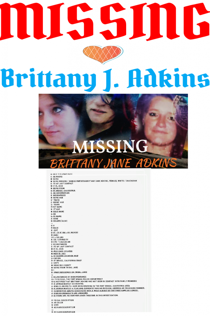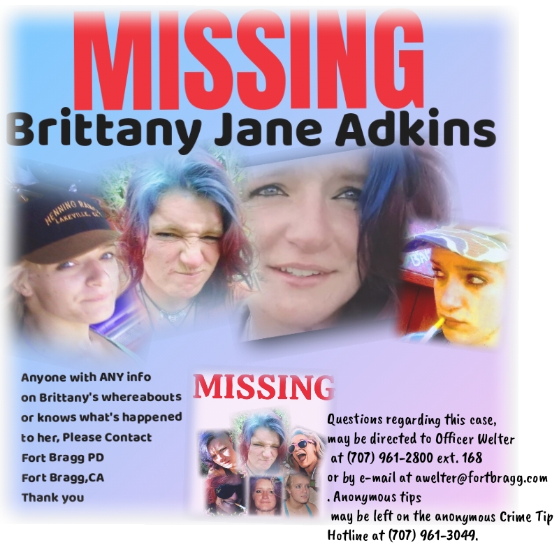 And within a short time of contacting the Mendocino News people my info on BRITTANY ADKINS was added as letter to the Editor letting them know another young woman was MISSING in Fort Bragg, CA. Also within this time range the Fort Bragg PD once again revealed to the public the info on another MISSING WOMAN , BRITTANY JANE ADKINS!