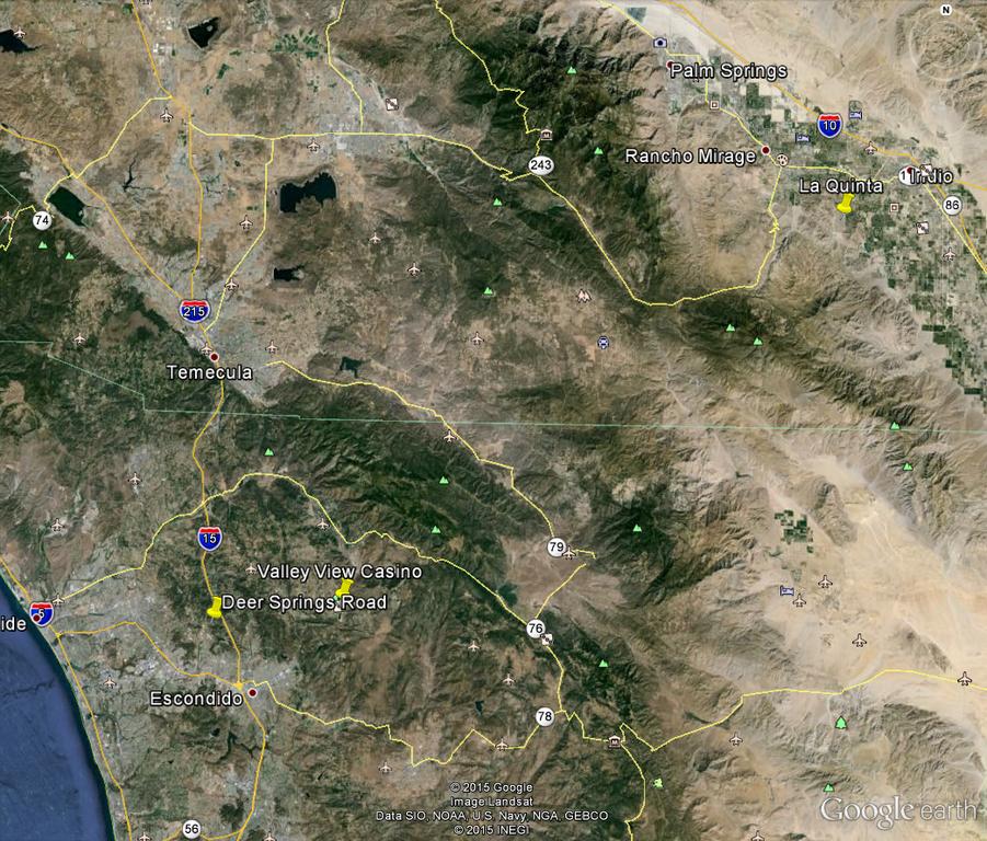 I find it very odd that they ended up on Deer Springs Road. As you can see in this map, Deer Springs Road is in a very different direction from the casino than La Quinta, where they were heading. Also, Deer Springs Road is WEST of the interstate, while Dianna and Cecil came from the east.