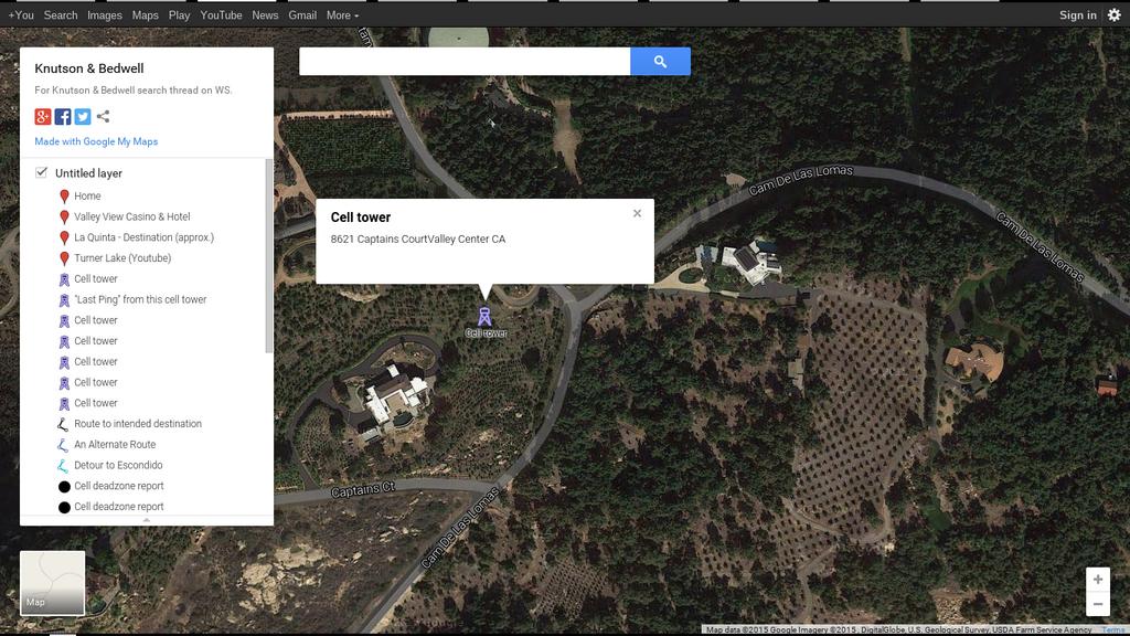 Thanks for the suggestion. I'm trying to find the exact location of the cell phone antenna. I found a T-Mobile antenna at 1037 Hubbard Ave., Escondido, CA. The ground elevation of this antenna is 1084 feet and the overall structure height is 32.2 feet. If they were feeling ill and wanted to go directly to a medical facility from the Casino, they might have headed down a back road to Escondido.