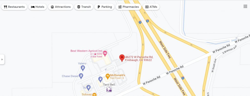 Last known location is Firebaugh, in central CA. It's off the 5 freeway and is a known stop for road trips.