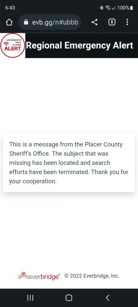 Doesn't sound like he was found safe...This is the announcement from Placer County. I am still hoping this kiddo is ok.