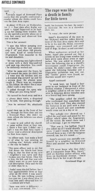 During the initial investigation, the crimes caused local cops to become suspects themselves. The rapist had to be a cop, some felt, because he seemed to know exactly what the cops were doing.