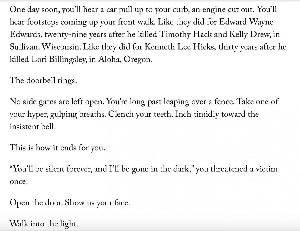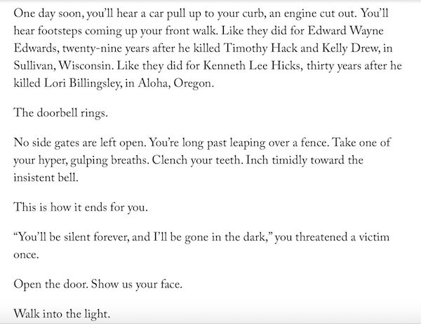 Michelle McNamera, "Letter to the Golden State Killer," THE NEW YORKER 10 Jan 2018.