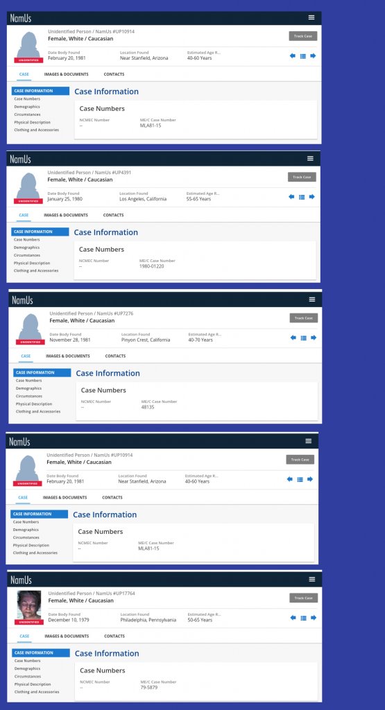 As mentioned, Edith had full dentures, while the Doe had a full upper denture and partial lower denture with teeth with fillings. Edith was older than the estimate, but that's really not a big deal, since age estimates of skeletal remains can be off along with estimations of race. Just a few examples of this: Marilee Bruszer was thought to be about 10-15 years younger than she really was based off her remains; Julie Davis (who was white) was thought to be black based off her remains, like Janet Lee Lucas (who was also white) was thought to be Asian, specifically Japanese, based off her remains - there was also a woman who was black found in North Carolina (Whose name I cannot recall) who was thought to be white based off her remains. Sorry, I went off on a tangent, but my point is this: