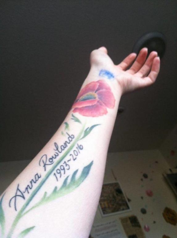 I went to high school with Erin. We were in a club together but I haven't spoken to her in years. She's incredibly kind person. Her step-sister was killed in a car accident last year and Erin's tattoo reads "Anna Rowland."