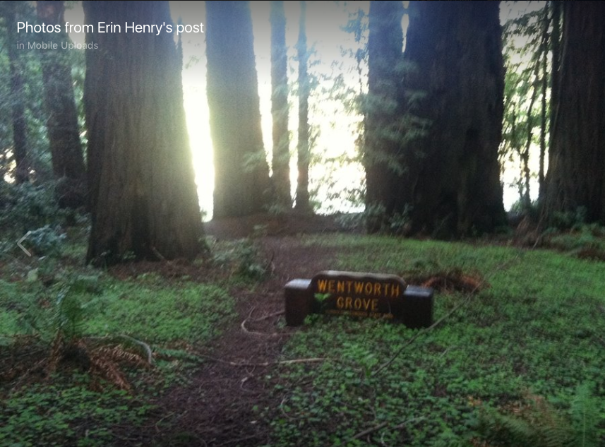 These books are the only places so far that I have found Wentworth Grove mentioned. There are pretty detailed directions. I once lived off the Avenue of the Giants out of Myers Flat, but never hiked in this area. It is much less traveled than other hiking trails there. I would definitely look there if I were searching for Erin, assuming she could drive there.