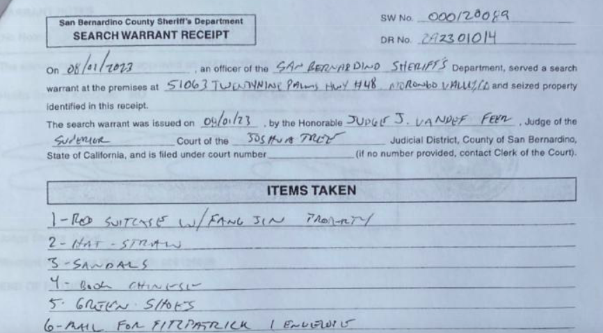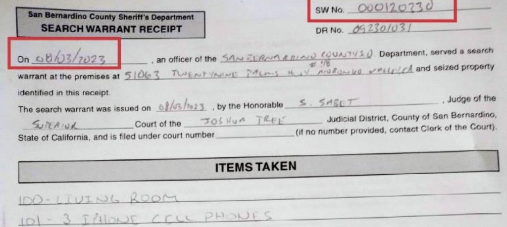 2nd search warrant Pg 12 of 12 8/03/23, items taken: 100-living room, 101-3 iPhone cell phones