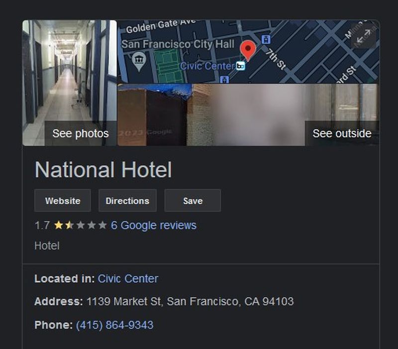 The National Hotel became a Budget Inn (not sure on the date) and after that was taken over by the Tenderloin Housing Clinic to home homeless people. After the Fire in 2022 all the residents were relocated. The below image from google street view was taken in May 2022 which shows it all boarded up, the fire happened in June so it must have literally reopened for the homeless and then burned down.