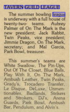 Wow some of the team names! Leather ambush, blue balls, out of the closet! Does the Tavern guild Bowling League still exist? The timing would be spot on. He said he'd contacted the bowling association but that doesn't mean they knew everyone's name. If that League still exists it's just possible there are still members who were playing back then too.