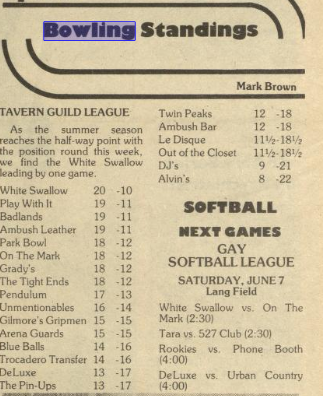 <modsnip: quoted post was removed> I totally forgot about the bowling! I went back through the Bay Area Reporter and found two pieces, the first from April 1980 and the second from June 1980 about the Tavern Guild Bowling League. I wonder if we could figure out if Farren was involved.