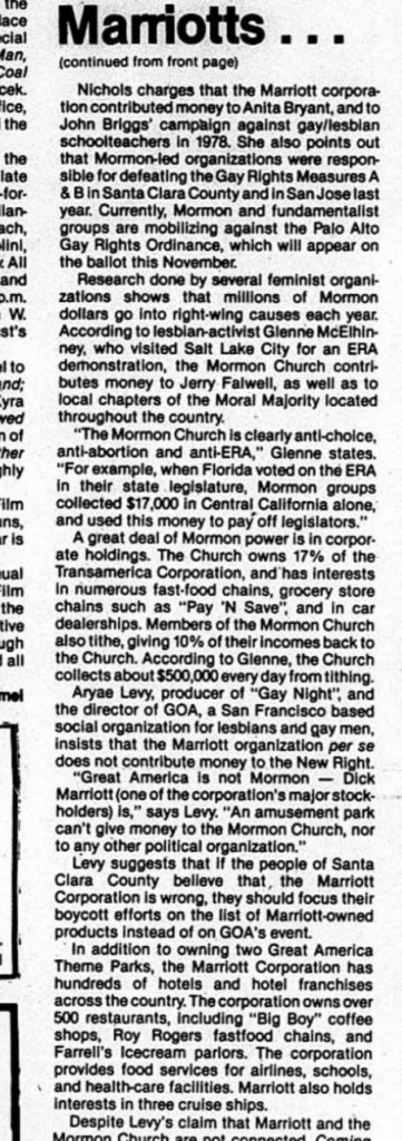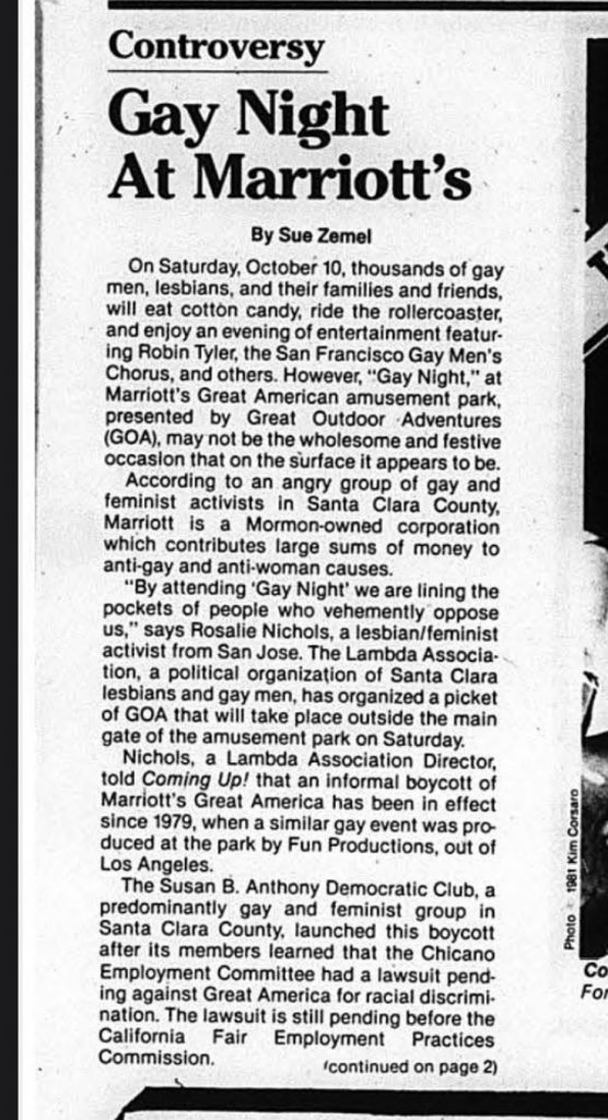 Here is a little bit of insight. Article October 1981 in Coming Up, seemingly a lesbian-oriented publication in the Bay Area. The article is about political objections within the gay community to an upcoming “Gay Night” at Marriott’s Great America because Marriott is a conservative corporation (this article could have been written last week about people objecting to corporations at pride I swear, good to remember there are no new stories lol). anyway it mentions a San Francisco sales representative for Great America by name. Have a read.