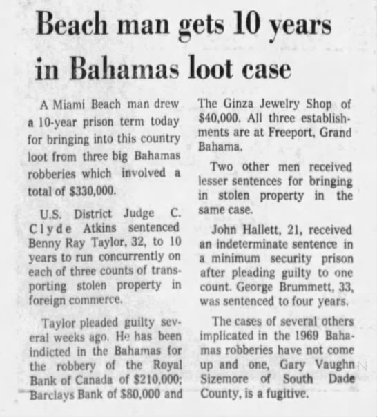 "In Bahama Case Benny Ray Taylor, 33, of Hollywood, pleaded guilty yesterday to transporting $329,000 in stolen cash, blank checks and jewels from the Bahamas to South Florida. At the same time, Taylor's red-haired wife, Sherry, and two South Florida men, William Carpenter and John Hallett, pleaded guilty in U.S. District Court, Miami, to conspiring to have the loot transported. No date was set for sentencing. Taylor had been accused of taking part in robberies at the Barclays Bank, Royal Bank of Canada and the' Ginza Jewelry Shop, all in Freeport, in 1969 and early this year. Charges are still pending against three other persons in connection with the robberies. They are George Brummett of Miami who was apprehended in Kentucky, George Traber, 37, of Miami Beach-and Shirley Sizemore of Miami. Mrs'. Sizemore's husband, Gary Vaughn Sizemore, is still being sought by the FBI. During one of the robberies, the bandits held police at gunpoint, took one officer hostage and wounded a civilian."