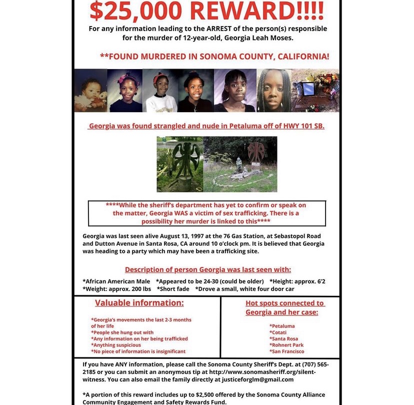 There is a reward for any information leading to the arrest of the murder of Georgia Leah Moses. You can also fill out the Silent Witness Form on SonomaSheriff.org to be anonymous. If you know something please say something.
