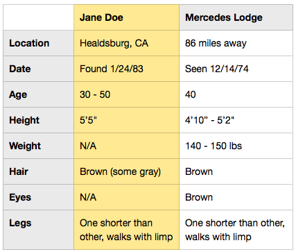 Thoughts on Mercedes Lodge? https://www.findthemissing.org/en/cases/33025/