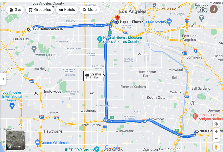 I also notice the Hope + Flower building is just a few minutes off the route between her home and the baseball diamond in Downey. Just seems interesting, it wasn't a separate location that she would set off for, far off her route home.