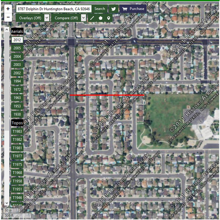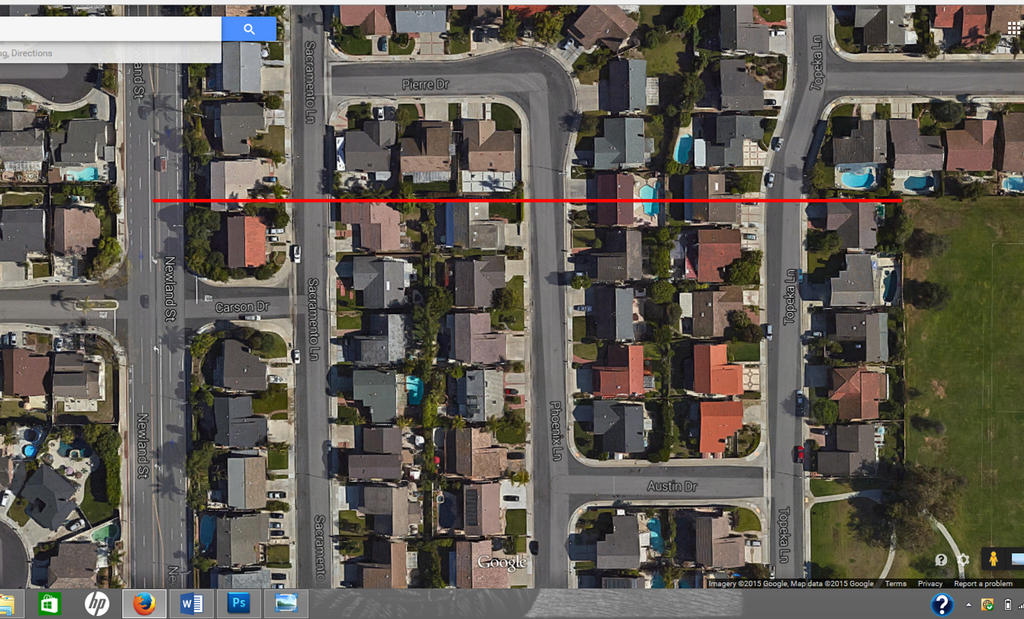Trying to narrow down even more closely where she was found, an article in the LA Times (April 15, 1968) had some additional information, describing her as lying face down in a drainage ditch separating two plowed fields "about 150 yards south of Yorktown Ave...." The article also seems to suggest that a dirt road might have run parallel to the ditch, saying "Tire tracks indicated a car had driven down the dirt road slightly past the location of the body and turned around to return to the street."