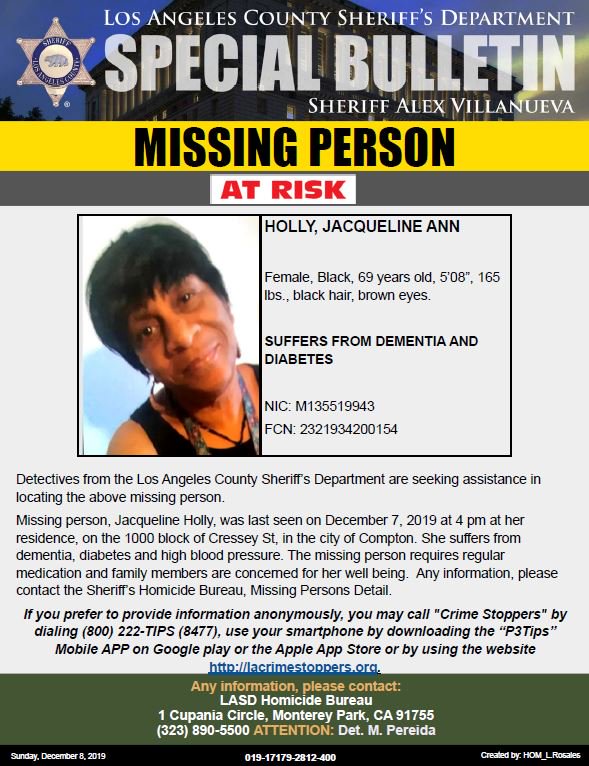 Jackie Holly was last seen Saturday night, the same day her sister died. Holly is described as a 69-year-old woman, 5 feet 8 inches tall, 165 pounds with black hair and brown eyes. She was last seen at her residence on the 1000 block of Cressy Street in Compton.