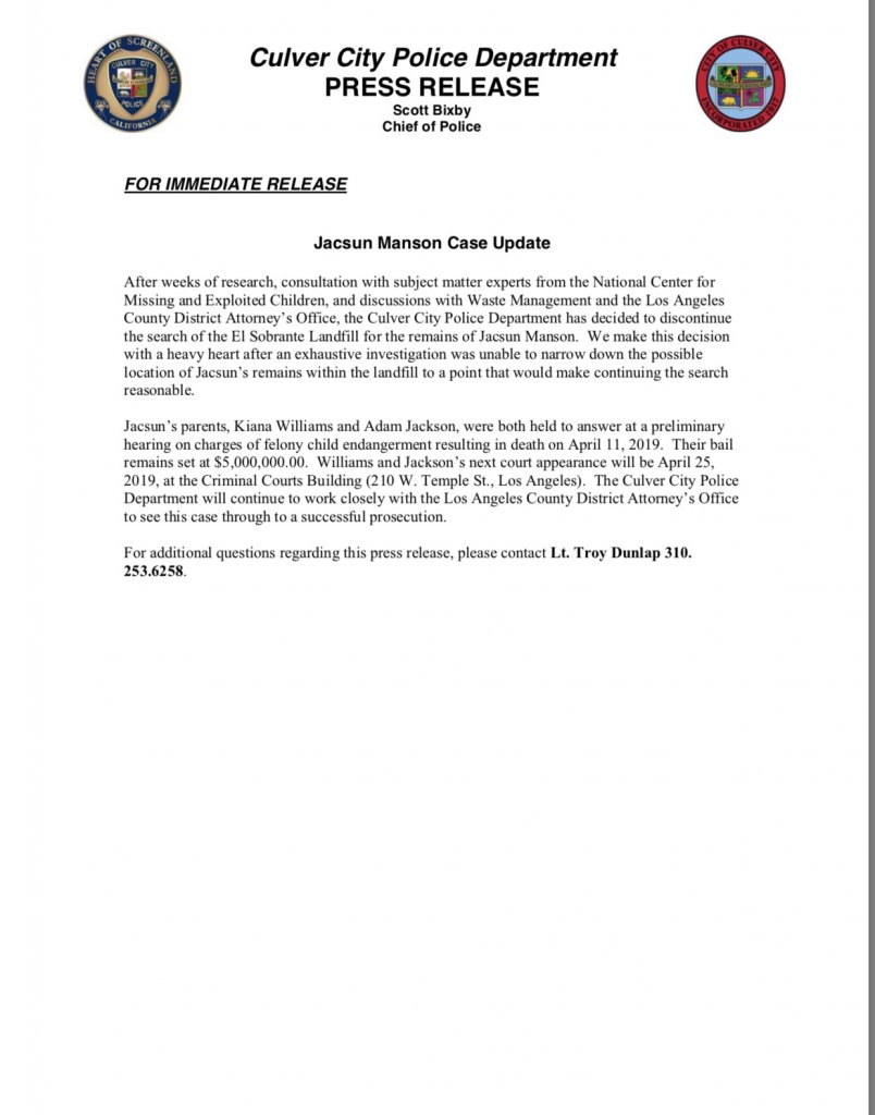 On Dec. 31, Manson & Williams were suspected of stealing a vehicle from a homeless transitional home in Culver City where they were living. They took off with the child inside. A few days after stealing the vehicle, authorities said Manson and Williams were arrested (1/3/19) on suspicion of breaking & entering into a car. At that time, Jacsun wasn't with them & they would not tell the L.A. County Dept of Children & Family Services where the baby could be found. After a few weeks of investigating, DCFS finally reported Jacsun missing to police (1/25/19). Throughout the investigating, his parents have stayed silent about his whereabouts. A judge won't allow Manson and Williams out until they cooperate with investigators. LE believe parents discarded the child's body in a dumpster somewhere near the Crenshaw Mall in Los Angeles. Investigators on Monday searched the El Sobrante Landfill in Corona.