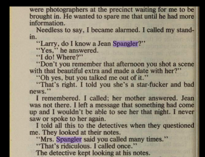 Given that Spangler referred to a man named Kirk in the note found in her purse, rumors began spreading as to the person's identity. Actor Kirk Douglas came forward and told authorities that Spangler had been cast as an extra in one of his recent films at the time, but said he barely remembered her. Spangler's mother stated that her daughter had mentioned someone named Kirk, but she had no idea who the man was.