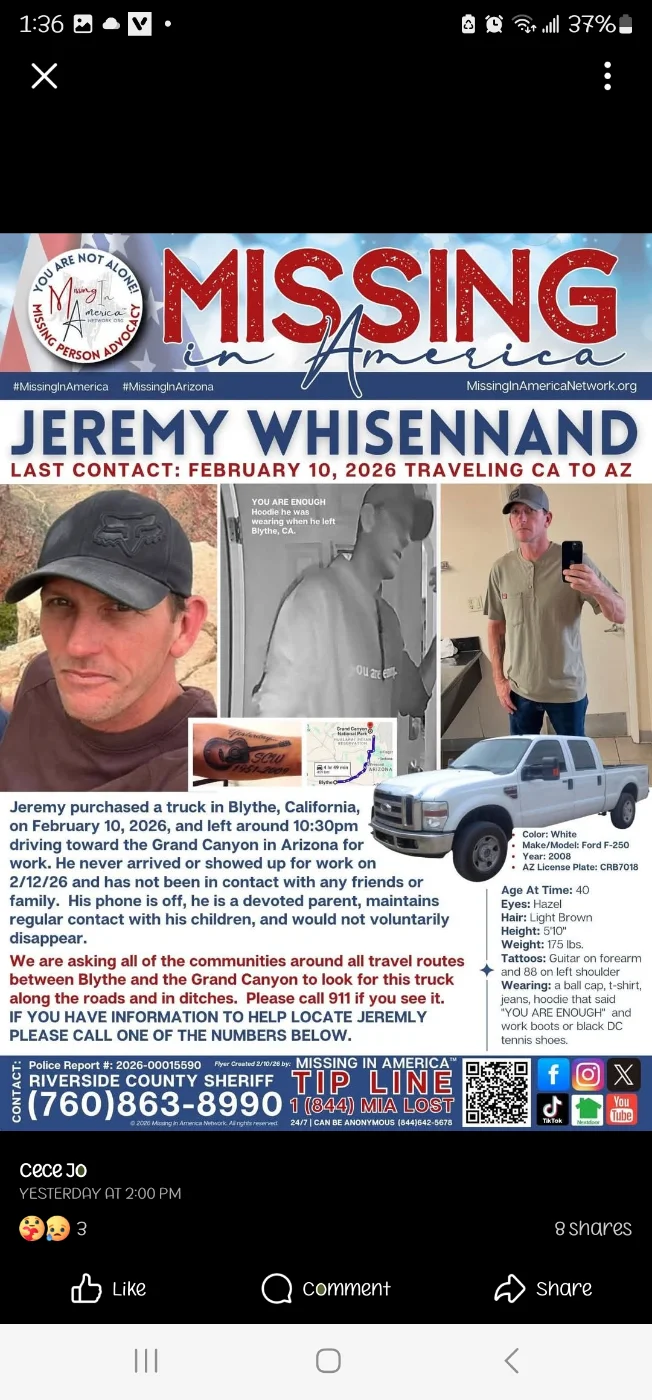 Jeremy Whisennand, 41, was last seen around 10:30 p.m. Feb. 10 in Blythe, California, the Colorado River Sheriff's Station said in a Feb. 21 social media post. Before arriving in Blythe, he had driven from his home in Tehachapi, California to Yuma, Missing in America Network posted.