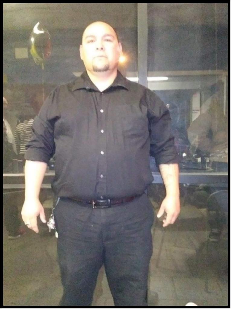 He stands five feet six inches tall and weighs 215 lbs. He is bald and has brown eyes.