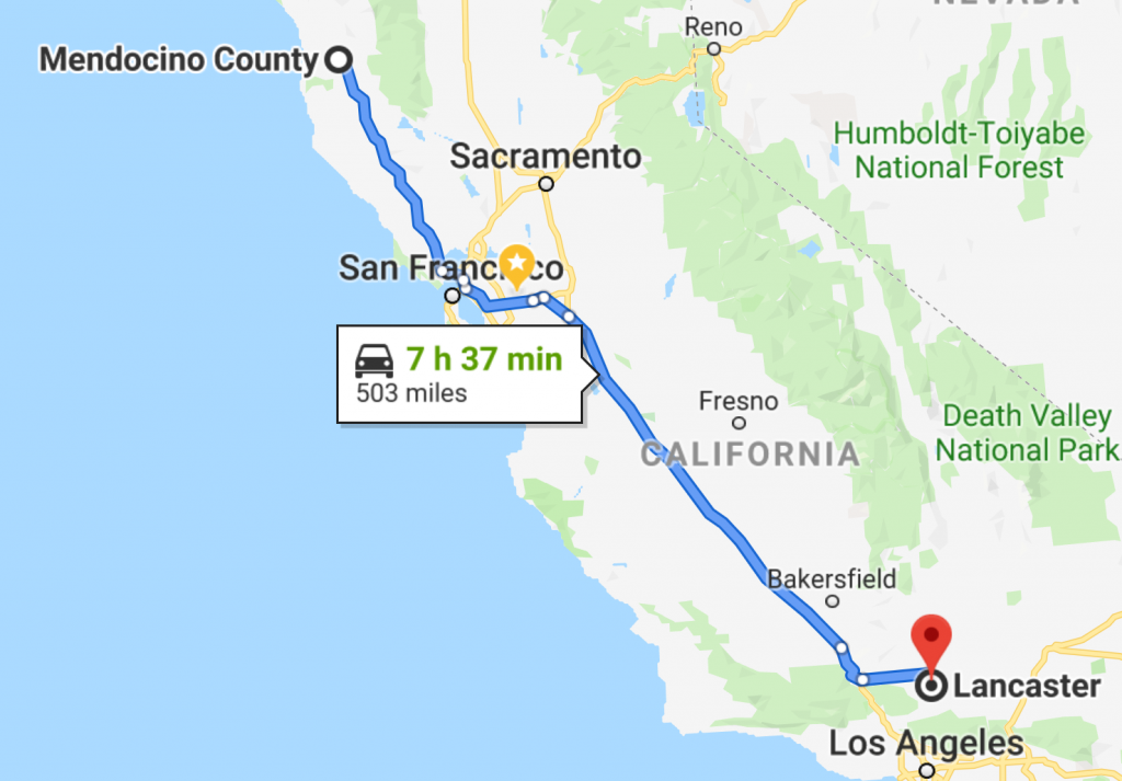 ETA: map & link! Driving time is approximate, because no exact locations were given. Mendocino is a large county!