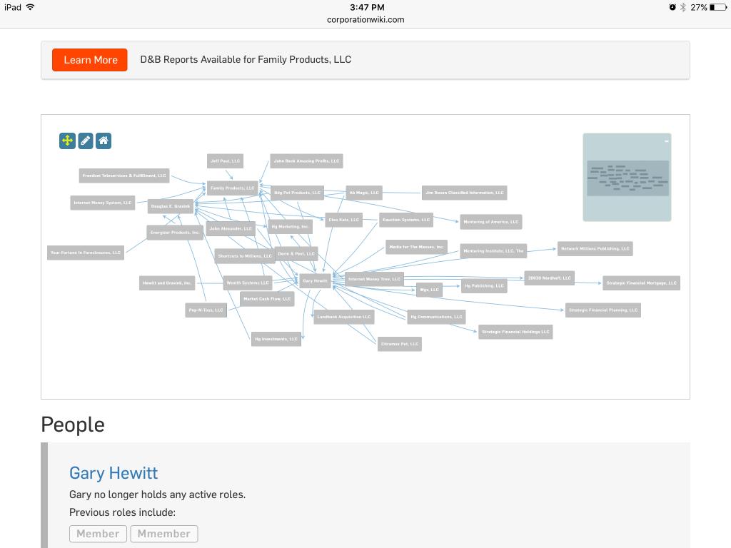 It shows the interconnection of all their companies. You can click on each one and it will show a different chart. Here is a screenshot of the chart for Family Products that also shows the companies the FTC went after along with Beck...Paul, Alexander, Family Products, Mentoring of America. It's a little hard to read, but Beck and Paul are at the top and you can find the rest.