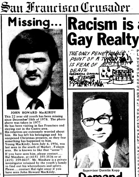 Born on July 6th of 1958, John MacKirdy was only twenty-two when he disappeared from San Francisco's Folsom Street in the South of Market district a week before Christmas. The young man, originally from the suburbs of Los Angeles, was visiting San Francisco and staying in the Castro District.