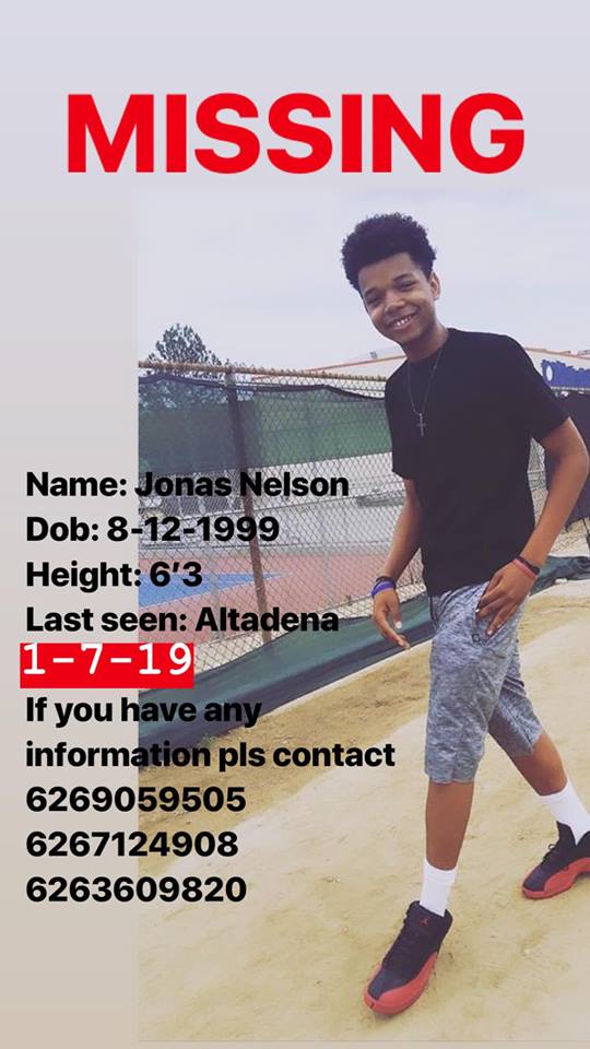 Los Angeles County Sheriff’s Department’s Missing Persons Unit Detectives are seeking the public’s assistance in locating Jonas Elijah Nelson. He is a 19 year-old male, Black who was last seen Sunday, January 6, 2019 at approximately 8:00 P.M. on the 4000 block of Chainey Trail, Altadena.