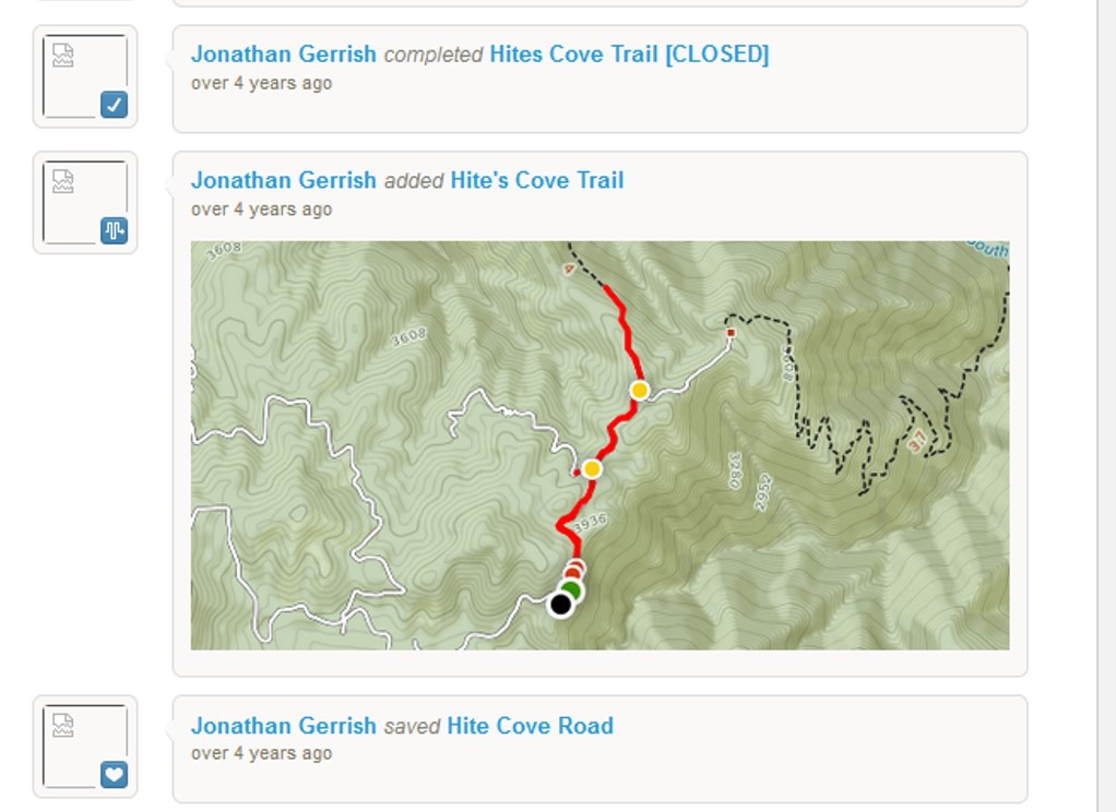 I think they were already quite familiar with the area. JG's AllTrails account shows he was there at the trailhead area at least 4 years earlier. This is a screen shot. Details of AllTrails hikes that old can't be reviewed but the map picture shows that he hiked part of Hites Cove Rd. and the Hites Cove OHV trail, but labeled his hike (incorrectly) as "Hites Cove Trail". This would have been before the fire. The "[CLOSED]" label reflects the trail's current status.