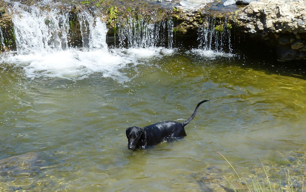 Yeah, I wouldn't get hung up on the lack of a water bowl, it doesn't mean the dog got no water. I drink wine without a wine glass. You may be wondering how that is possible. Well, I have a coffee mug that says "This is probably wine", a gift from my daughter. Easier to clean, less likely to get broken or knocked over. But back to the dog... here's the logic: the sheriff says they did the loop, and he would know. The dog could not possibly have made it that far without water. Therefore, the dog got water. As we have discussed many times, dogs are more susceptible to heat than people because they mostly cool thru panting, so even with water to drink, I wouldn't expect Oski to make it as far as his people did. Was he carried? Possibly. But if I did that hike with my dog, as soon as we got to the river she would have gone swimming and gotten a drink, and at every opportunity thereafter. (In summer we do keep her leashed and I check the water quality before we let her go) So my dog would have been wet and hydrated starting up the Savage Lundy Trail, which would have allowed her to make it a lot farther than would otherwise be possible. The photos of G-C hiking with Oski show him off leash, so I think it's a reasonable hypothesis that he cooled off in and drank river water during the several miles they hiked beside the river. MOO. Now the gratuitous photographic proof: