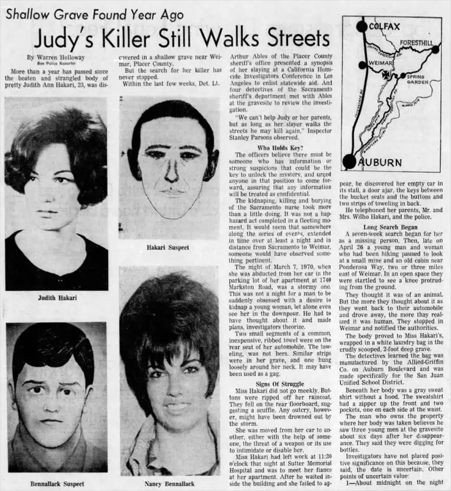 "On March 7, 1970, Judith Ann Hakari finished her regular shift at Sutter Memorial Hospital in East Sacramento at around 11:30 PM. Before Judy left, the 23-year-old nurse called her fiance, Raymond Willis, to let him know she was on her way home. They planned to meet at Hakari’s apartment at 1720 Markston Way around midnight that evening". She dissapeared. Her body was found on April 25th.