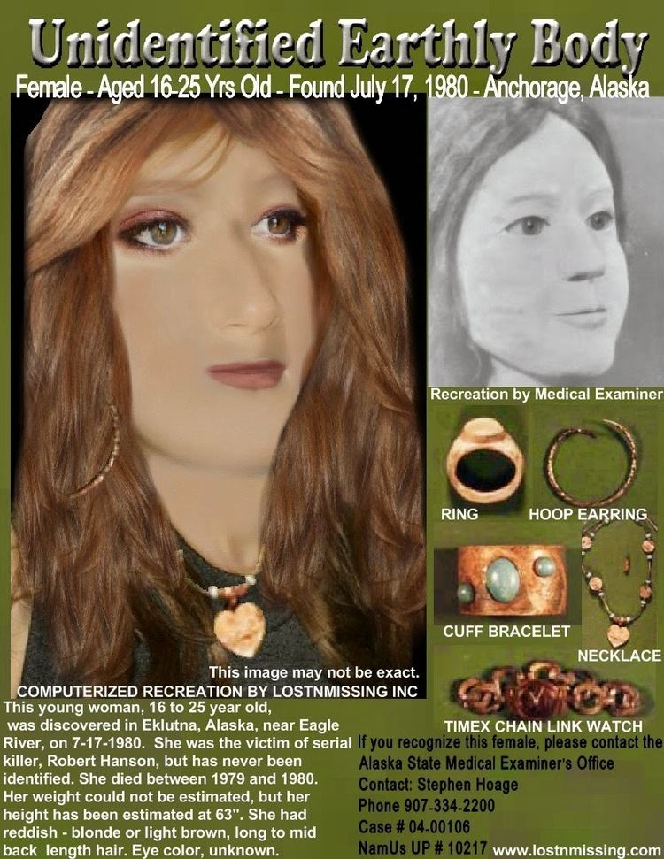 I'm not willing to rule her out, though Eklutna Annie was described as having strawberry blonde hair. I wish, considering the recent cold case successes in familial DNA, that they'd put an express lane in the DNA sequencing for ALL the does in the US.