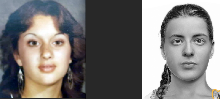 oh wow, this is an amazing visual match! the eyes, the nose (especially the bridge and directly between the eyes!!), the lips, the face/jaw shape... they are all very similar in my opinion. i'd say the differences are very minimal and could potentially be explained (reconstructions are never 100% accurate anyway): it looks like Julie plucked her eyebrows, and that her actual brow bone wasn't as high up as she plucked them; you can see that in the photos of her from when she was slightly younger. and while it may be a bit of a stretch, i have heard of some people plucking their widow's peak. her widow's peak seems most noticeable in this photo (and even then it's not super prominent), but again in her younger photos you can't really tell that she has one. the only part that i can't seem to think of an explanation for is the "deformed right ear", but because this doe was found in 1984, then maybe it could have somehow become that way in the intervening years???
