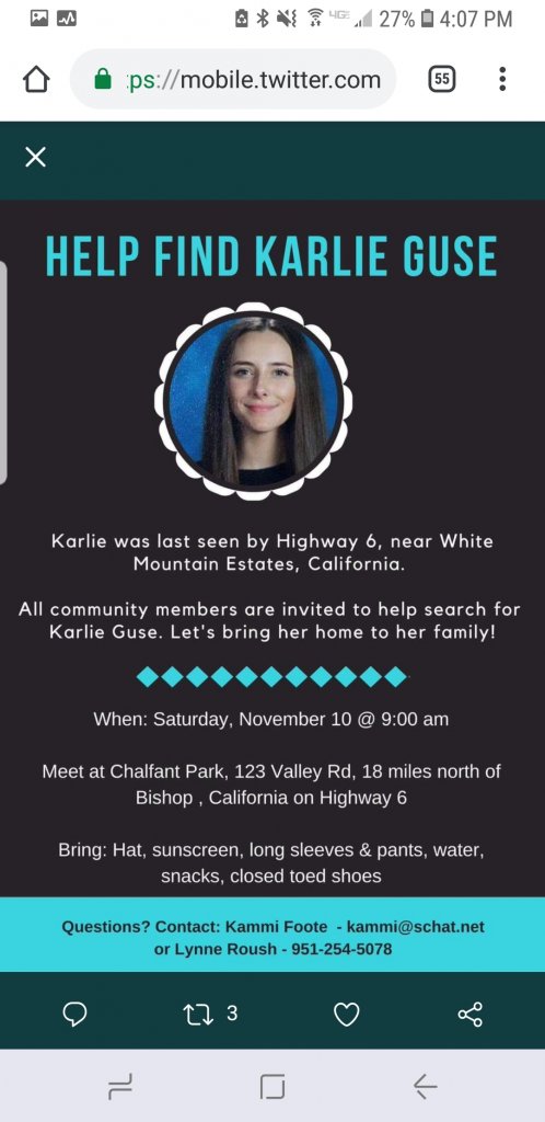 It has been over two weeks since 16-year old Karlie Lain Gusé went missing from her home in Chalfant, California, on Saturday, October 13, 2018. Despite a week-long search of the surrounding high desert and a... https://www.facebook.com/MonoSheriff/posts/2183552324990322 …