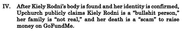 The ones who really bothered me went after Keily's own mother, published on yt her taxes, her covid business loans and accused her of trying to gain $$ from her daughter's death. Sounds a lot like the Upchurch charges, imo.