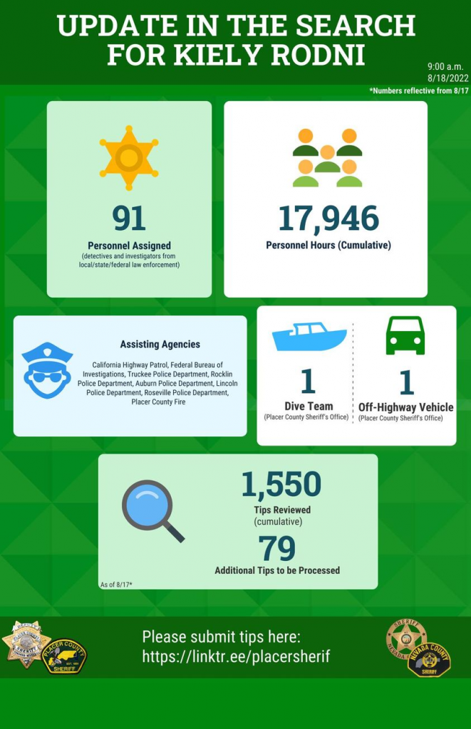 8/18/2022 -- Today is day 13 of the investigation for 16-year-old Kiely Rodni. The Placer County Sheriff’s Office and Nevada County Sheriff's Office continue to deploy numerous resources to locate Kiely and her vehicle. Kiely was reported missing on August 6th, after she attended a party with 200-300 juveniles and young adults at the Prosser Family Campground, in Nevada County. The Placer County Sheriff’s Office is leading a task force of detectives from local, state, and federal agencies – they continue to follow up on leads and conduct interviews to find Kiely. The Placer County Sheriff’s Office Dive Team and Off-Highway Vehicle Team searched by water and by ground, Wednesday, but were unable to locate Kiely and her vehicle. The figures outlined above are reflective of investigative and search and rescue efforts from August 17th.