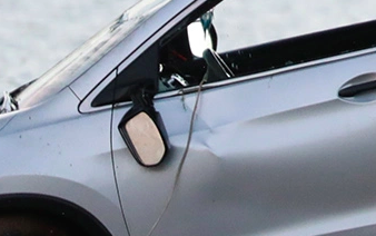 The dent on her door bulges outward. I think her vehicle might have been on its side in the lake?