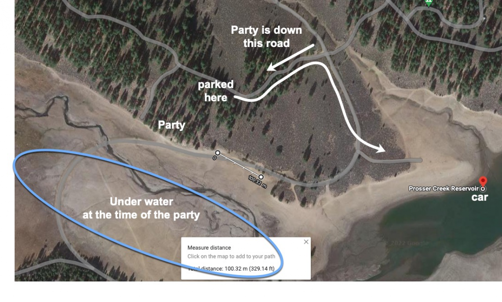 You know, the Google Maps research that @wnk did up thread (just catching up from last night, wow!) struck me as a possible scenario here. He/she found that Google Maps plots two options to exit the party location. One is the one we all know about and then the one that we've come to know as the 'white road' from @otto, that may only be passable in winter.