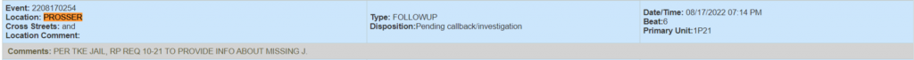 But recall, the NCSO took over from PCSO when KR's car was found in their county, 8/21. But even on that date there is NOTHING about AWP finding KR. So I wonder if some entries in these logs are redacted if related to an ongoing investigation. Anyone know?