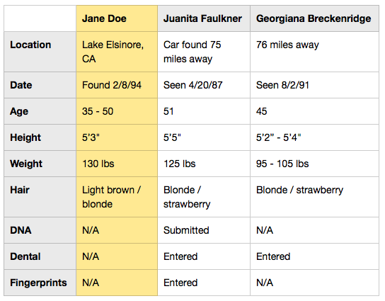 [*]The victim was discovered on February 8, 1994 in Lake Elsinore, Riverside County, California.- Estimated Date of Death: 1990 to 1994.