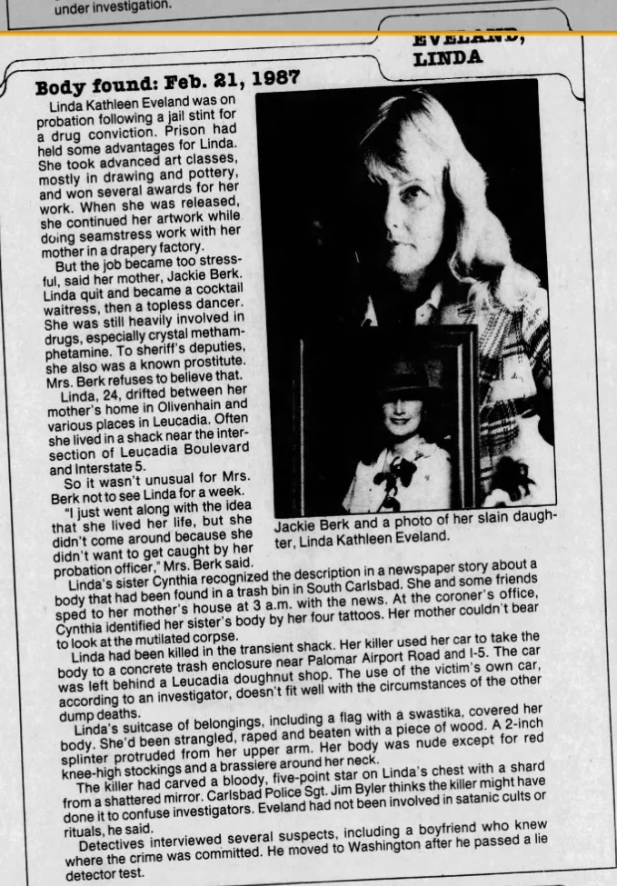 Linda Kathleen Eveland, 24, was found in a trash bin in South Carlsbad on 21 February 1987. Linda worked as a topless dancer at Dirty Dan's at 939 North Coast Highway in Oceanside (near Camp Pendleton). Police allege that Linda was a known prostitute, although her family denies this. Linda's family does admit that she had a drug problem - crystal meth. Linda lived in Encinitas near the interchange of Leucadia Boulevard and I-5. Linda had four tattoos.