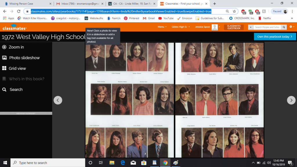 [h=1]Linda Ann Miller[/h] Case Classification: Missing Missing Since: July 1, 1973 Location Last Seen: San Rafael, Marin Co, California [h=5]Physical Description[/h] ** Listed information is from the time of disappearance. Date of Birth: July 3, 1954 Age at Time of Disappearance: 19 Race: White Gender: Female Height at Time of Disappearance: 64 inchs Weight at Time of Disappearance: 112 lbs Hair Color: Brown Eye Color: Brown Alias(s) / Nickname(s): None Distinguishing Marks/Features: Unknown Dentals: Not Available Fingerprints: Not Available DNA: Available [h=5]Clothing & Personal Items[/h] Clothing: Unknown Jewelry: Unknown Additional Personal Items: Unknown [h=5]Circumstances of Disappearance[/h] In 2001, Linda Miller was reported missing by her sister. She reported that Linda Miller went to Guadalajara, Mexico in July 1973 with a male friend possibly named "Cary Kristal" and she never returned. [h=5]Investigating Agency(s)[/h] If you have any information about this case please contact; Agency Name: Marin County Sheriff's Office Agency Contact Person: Edmund Rudolph Agency Phone Number: 415-499-7278 Agency Case Number: SO01-6009 NamUs Case Number: MP #11802 Please refer to this number when contacting any agency with information regarding this case. [h=5]Information Source(s)[/h] NamUs |