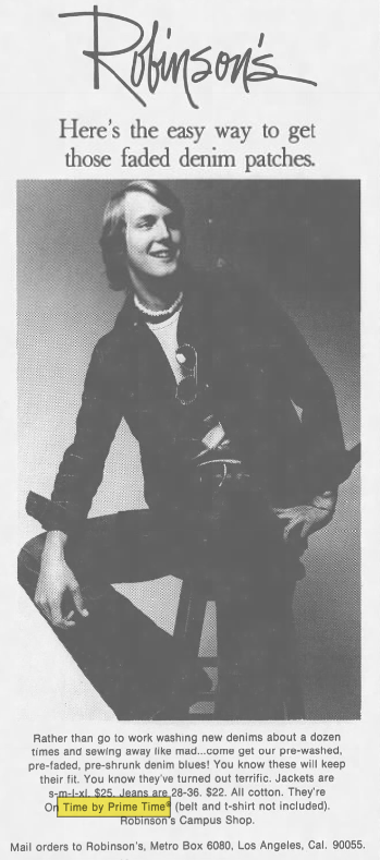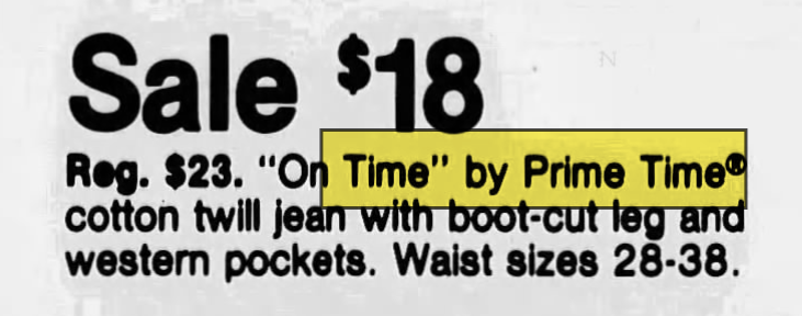 Looks like "On Time" by "Prime Time" was a brand of Men's jeans that were sold by JC Penny, J.W Robinsons (defunct as of 1993), and Grodins (defunct as of 1993). The main place they were advertised was Southern California, but they were available in the Bay Area. The price of the Jeans were originally $18-23, which would be about $100 ish in modern day standards. My guess is that she got the jeans second hand then altered them.